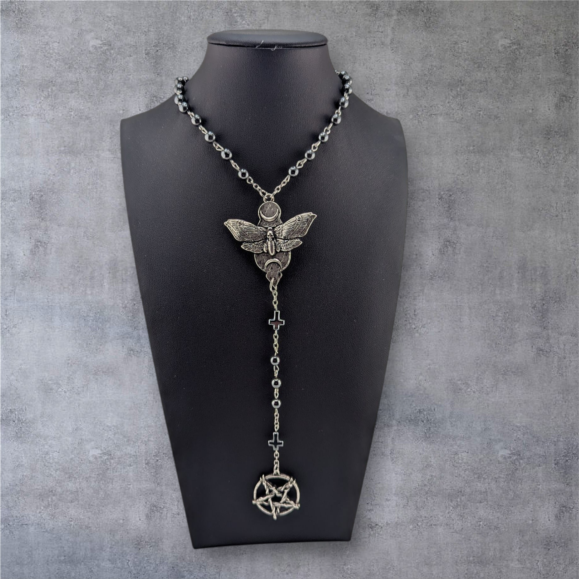 Hand-cast in the USA from nickel-free pewter and finished in genuine antique silver, the Moth Rosary drapes elegantly with gothic grace.